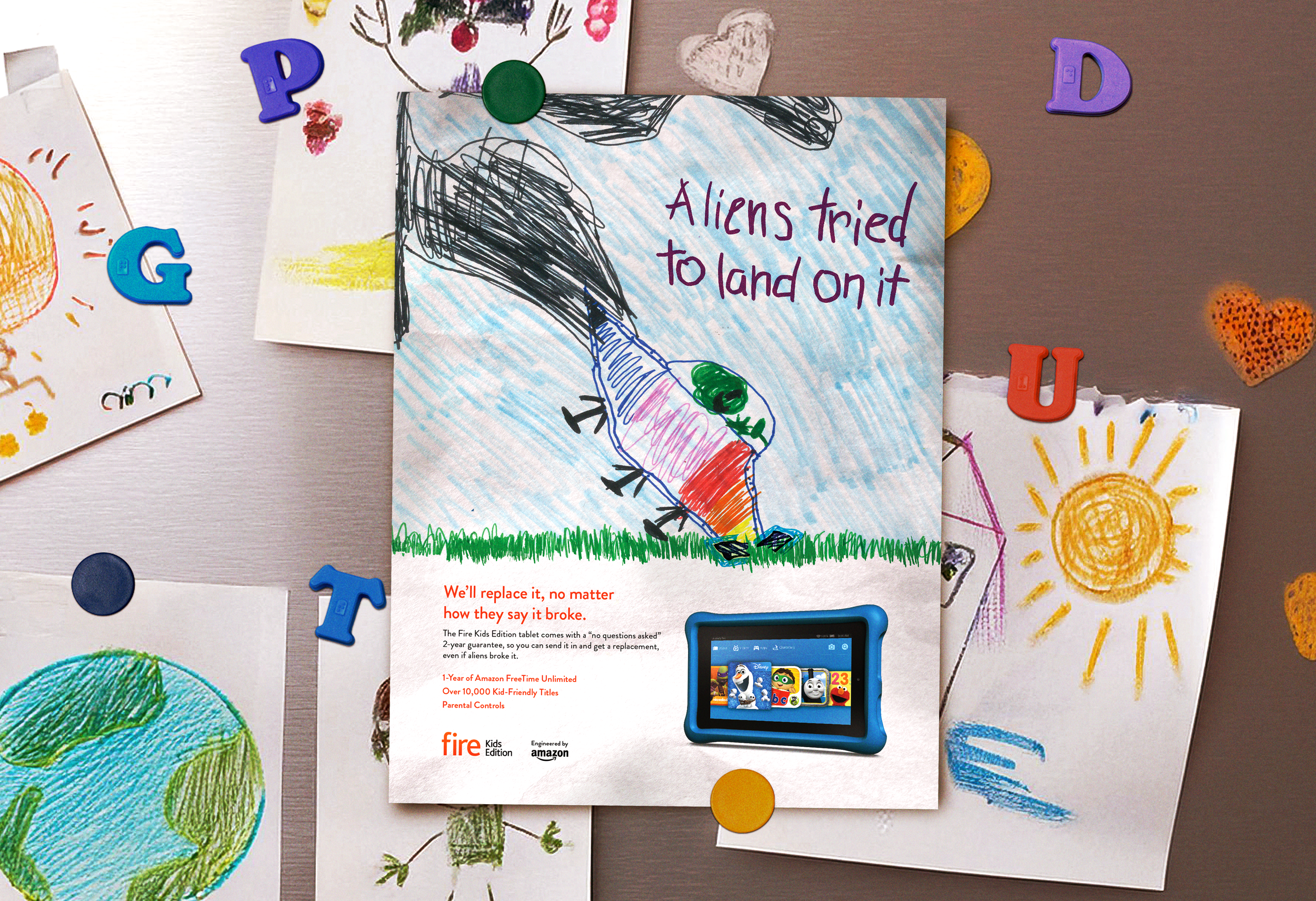 All the drawings in this campaign were created by the children of our team members—I asked them to draw how a Fire tablet could break.