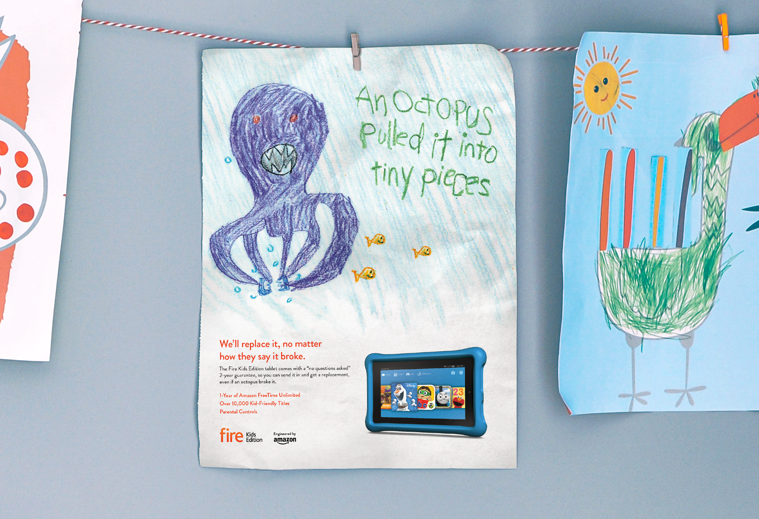 That simple insight inspired this campaign for the Fire Kids Edition Tablet. Each ad features a kid’s drawing of how they imagine a Fire tablet could break.